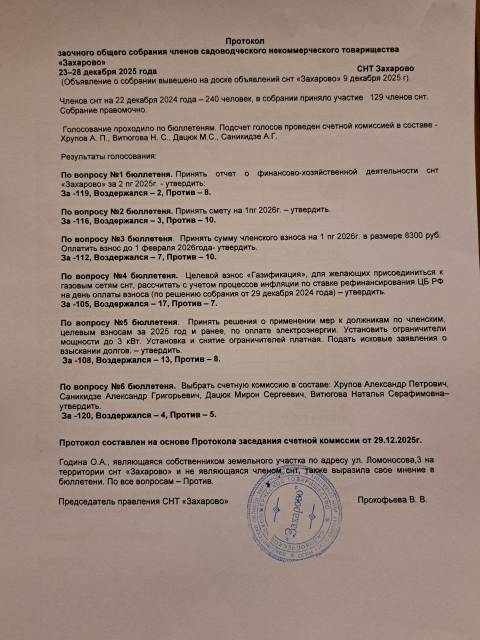 Протокол общего собрания членов СНТ "Захарово"